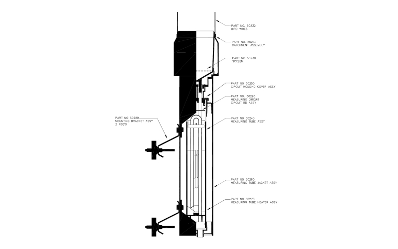 集水桶中收集到的雨水或雪被導(dǎo)入測量室;1 毫米的降水會在室內(nèi)產(chǎn)生 5 毫米的上升。 色譜柱液位由電容探頭檢測,并轉(zhuǎn)換為可由外部電子設(shè)備可讀取的線性電壓信號。當(dāng)色譜柱高度達(dá)到 250 毫米(50 毫米沉淀)時,集水桶自動清空并重復(fù)該過程。 總降水量可以通過數(shù)據(jù)記錄器或記錄器進(jìn)行跟蹤。