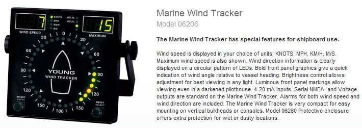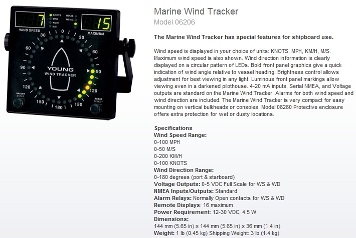 YOUNG 海用06206風(fēng)速顯示可以根據(jù)您選擇單位進行顯示:KNOTS、MPH、KM/H、M/S。最大風(fēng)速被保存到顯示器上直到被操作者重置。 06206風(fēng)向信息被清晰的顯示在LED圓形盤上。醒目的前向面板圖形顯示與船前行方向相關(guān)的風(fēng)向角。可以調(diào)整亮度控制以在任何光源下得到最佳顯示效果。發(fā)光的前向面板標(biāo)識甚至能在黑暗的駕駛室內(nèi)看得見。