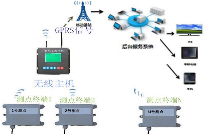 每個監(jiān)測點(diǎn)通過無線方式和無線接收主機(jī)通信,無線主機(jī)匯集器自身帶有液晶顯示屏,可設(shè)置各種參數(shù)、設(shè)置測點(diǎn)終端地址、等?,F(xiàn)場實(shí)施方便,終端地址可自由配置,無需中繼,單跳1000m,匯集主機(jī)可以將數(shù)據(jù)以WIFI\GPRS\RJ45\485等方式上傳服務(wù)器。服務(wù)器安裝全中文控制管理軟件,對實(shí)時數(shù)據(jù),圖形化界面顯示并存儲,歷史數(shù)據(jù)隨時可查,可下載。
