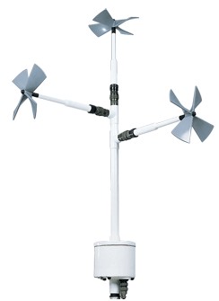 The three Propeller Anemometer sensors are mounted at right angles on a common mast. Each sensor measures the wind component parallel with its axis of rotation. Propeller response as a function of wind angle approximates the cosine law, allowing true wind velocity and direction to be calculated. The UVW Anemometer is designed for maximum sensitivity at lower wind speeds. Optional carbon fiber thermoplastic (CFT) propellers are available for applications requiring greater range and durability. Rain and dust are excluded from the precision bearings by a continuous duty air blower that keeps the instrument under a slight positive pressure. For single axis applications, individual propeller anemometers are available separately (see Model 27106)
