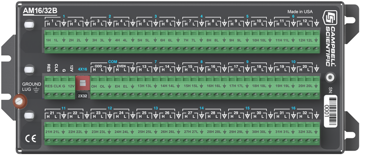 AM16/32B擴(kuò)展板增加了數(shù)據(jù)采集器可以測量的傳感器的數(shù)量。AM16/32B可以通過4個(gè)復(fù)用端口(COM)順序地切換測量16組4線制的傳感器(共64線)。另外,用手動(dòng)轉(zhuǎn)換開關(guān)可以把AM16/32B切換到2線模式,來順序測量32組2線制傳感器(總數(shù)同樣為64線)。
