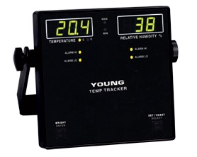 Measured values are displayed on the front panel: temperature on the left, relative humidity or dewpoint on the right. Maximum and minimum values are saved and can be viewed at any time. The Temp Tracker includes the following useful features: fully-programmable alarms, calibrated voltage outputs, and RS-485 output. Input for the Temp Tracker is supplied by Model 41382LC Relative Humidity/ Temperature Probe which provides a convenient 4-20 mA current loop signal for each channel. (Model 41003P Radiation Shield is suggested)