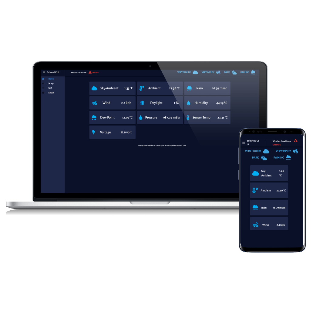 Boltwood Cloud Sensor III 利用 Wi-Fi 技術(shù)對最多五臺計算機進行無線狀態(tài)監(jiān)控。它支持 ASCOM Alpaca 界面和基于瀏覽器的監(jiān)控,提供與任何操作系統(tǒng)的兼容性。網(wǎng)絡(luò)操作和 Wi-Fi 熱點模式均可用。對于 Windows 用戶,我們還提供 Clarity III 軟件,提供額外的設(shè)置和數(shù)據(jù)記錄功能。
